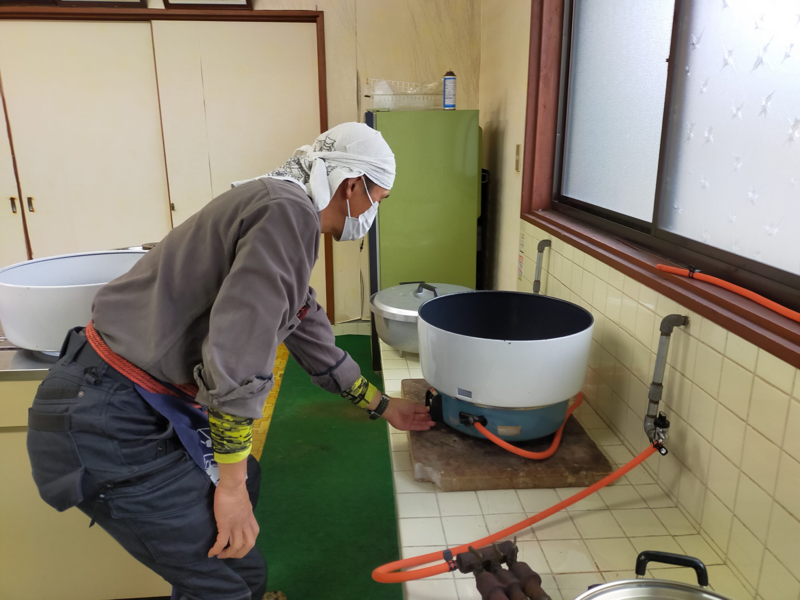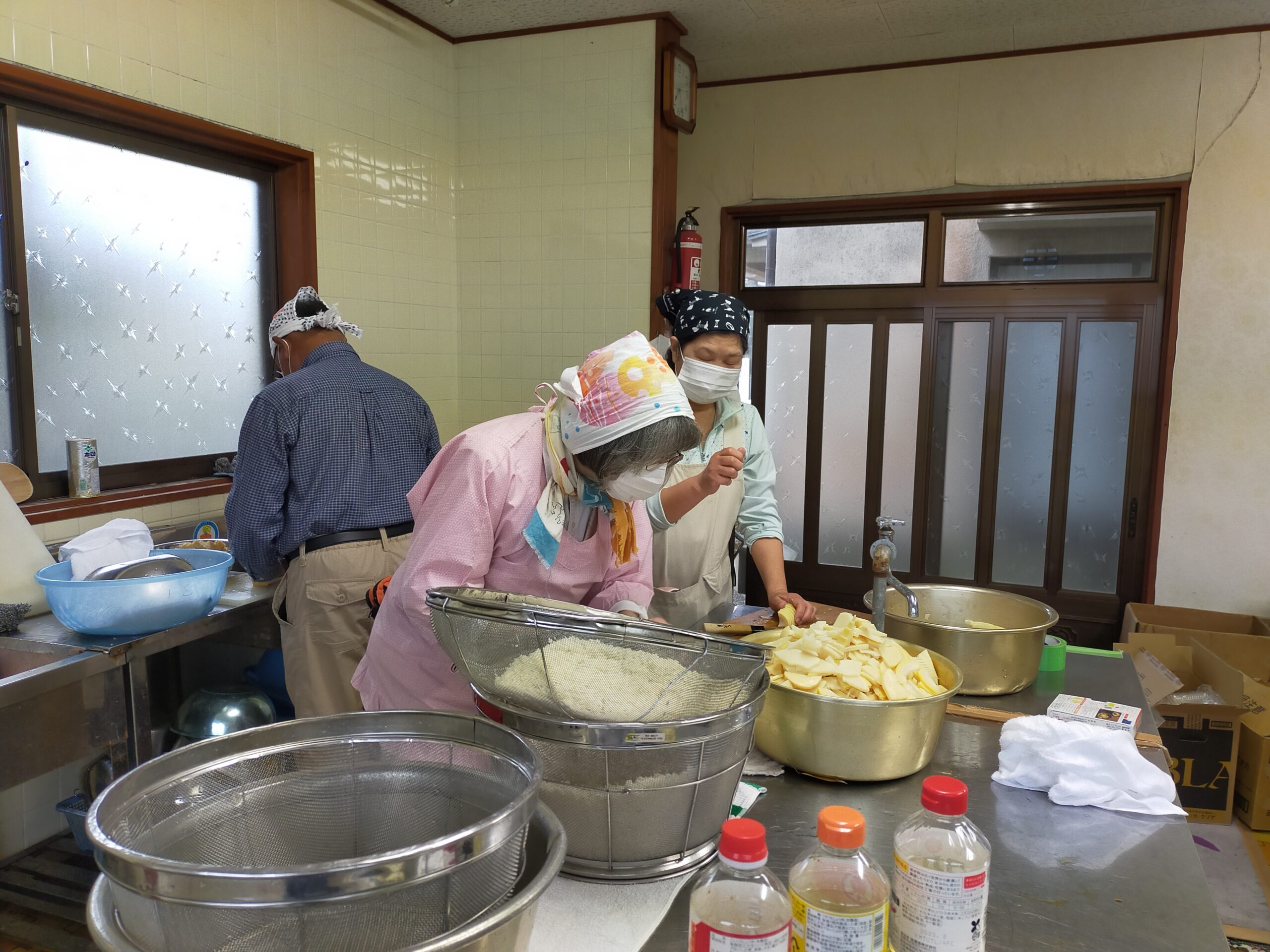 こちらも初めてのことで五升炊きのガス窯二台でかしわ飯を炊き、会長が筍を掘って水煮にしてきてくださったので、それを炊いて添えました。