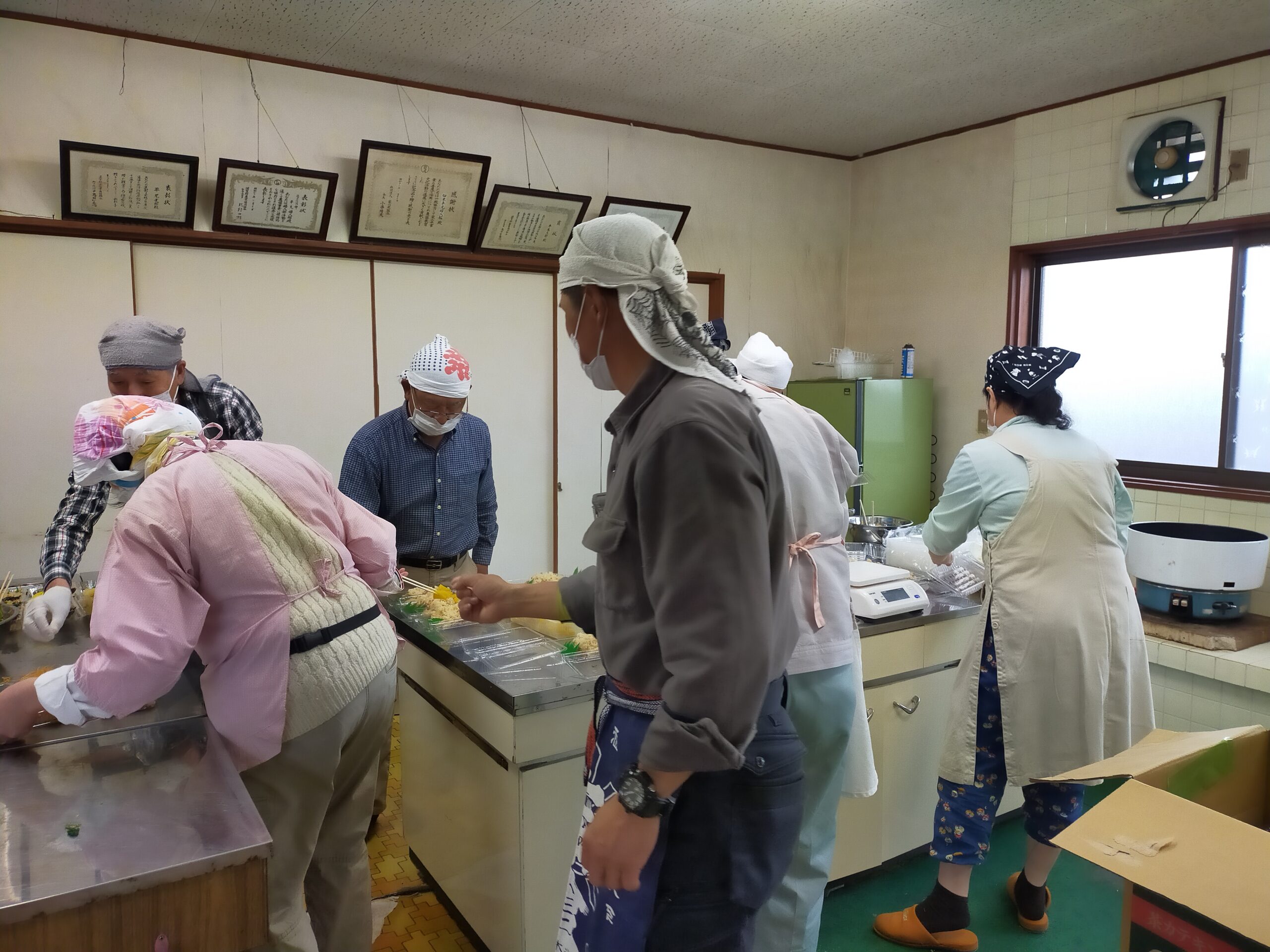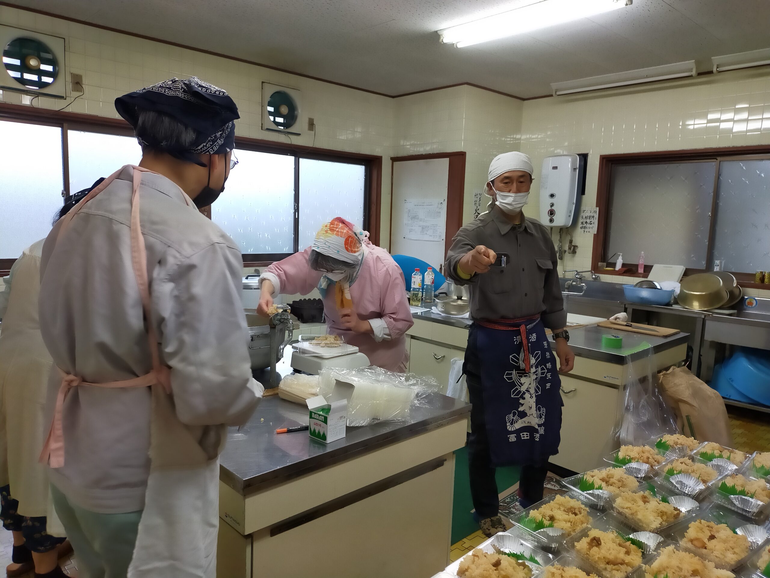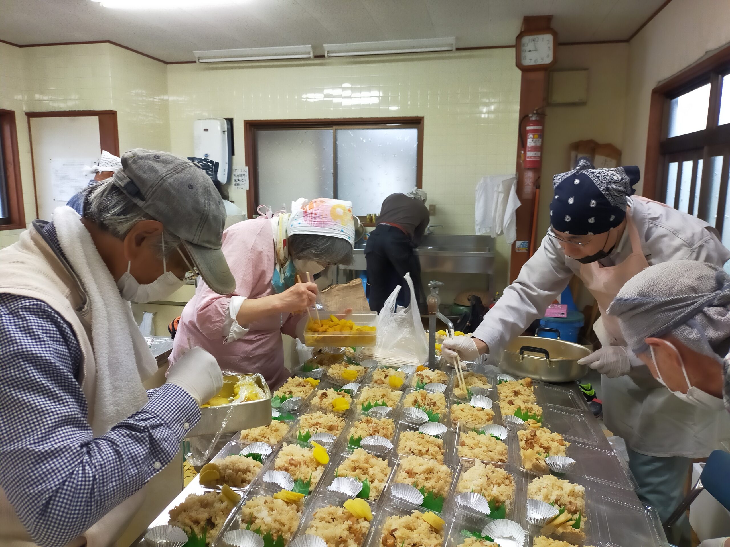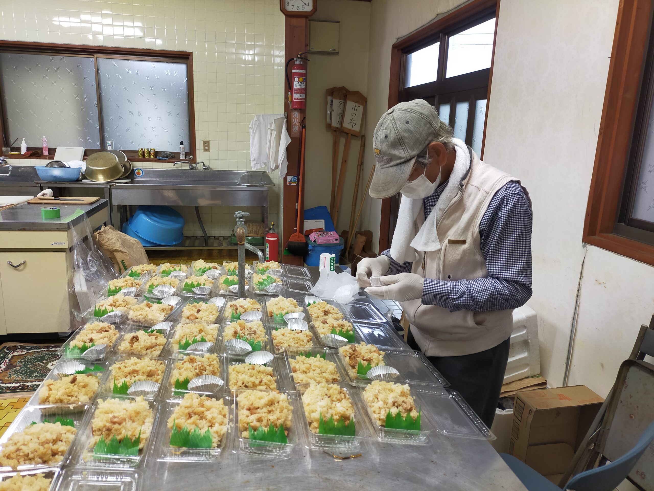 せっかくきていただくので会員でいつも作っているかしわ飯を作りパックに詰めてお土産弁当を作ることにしました。