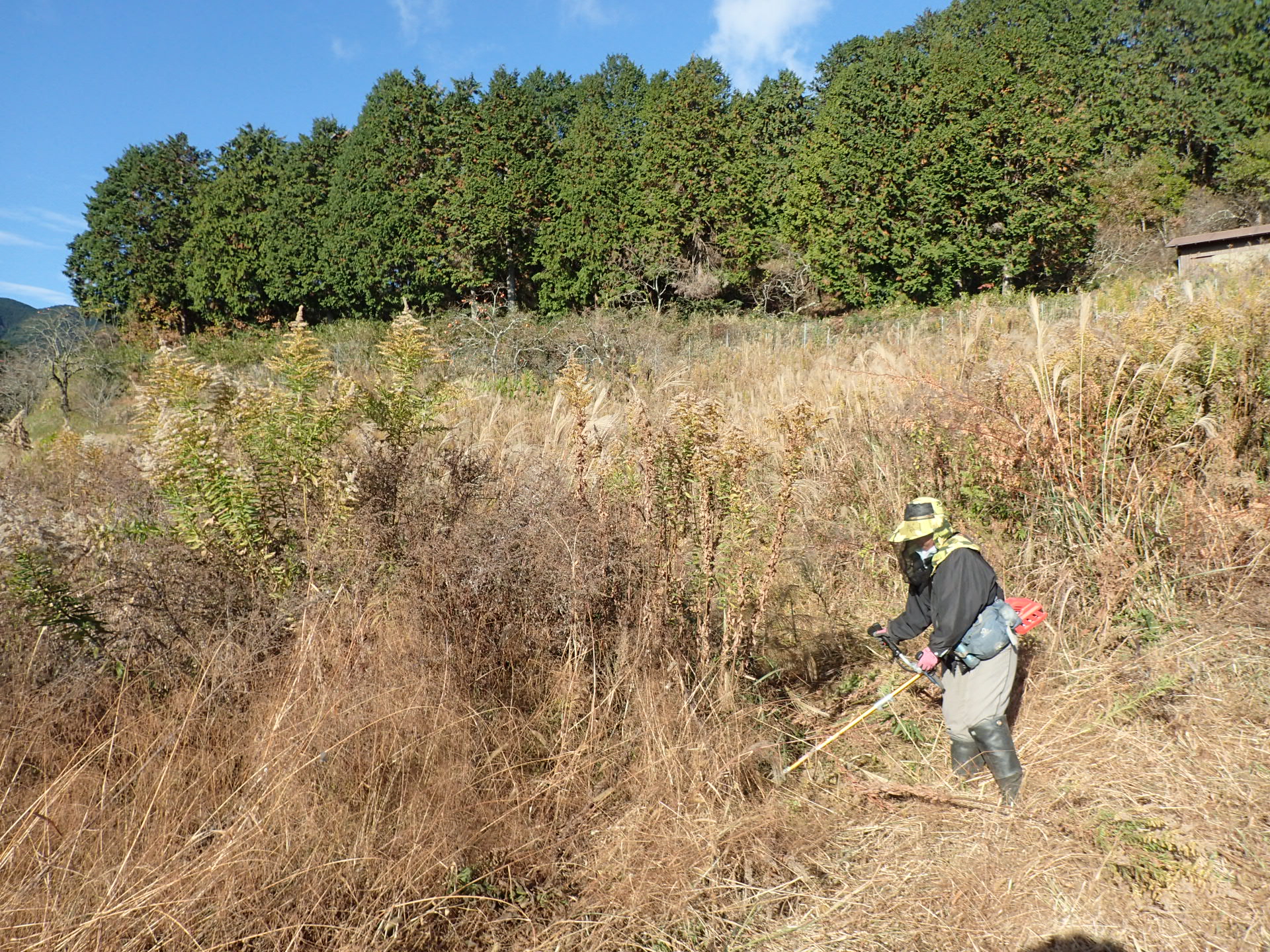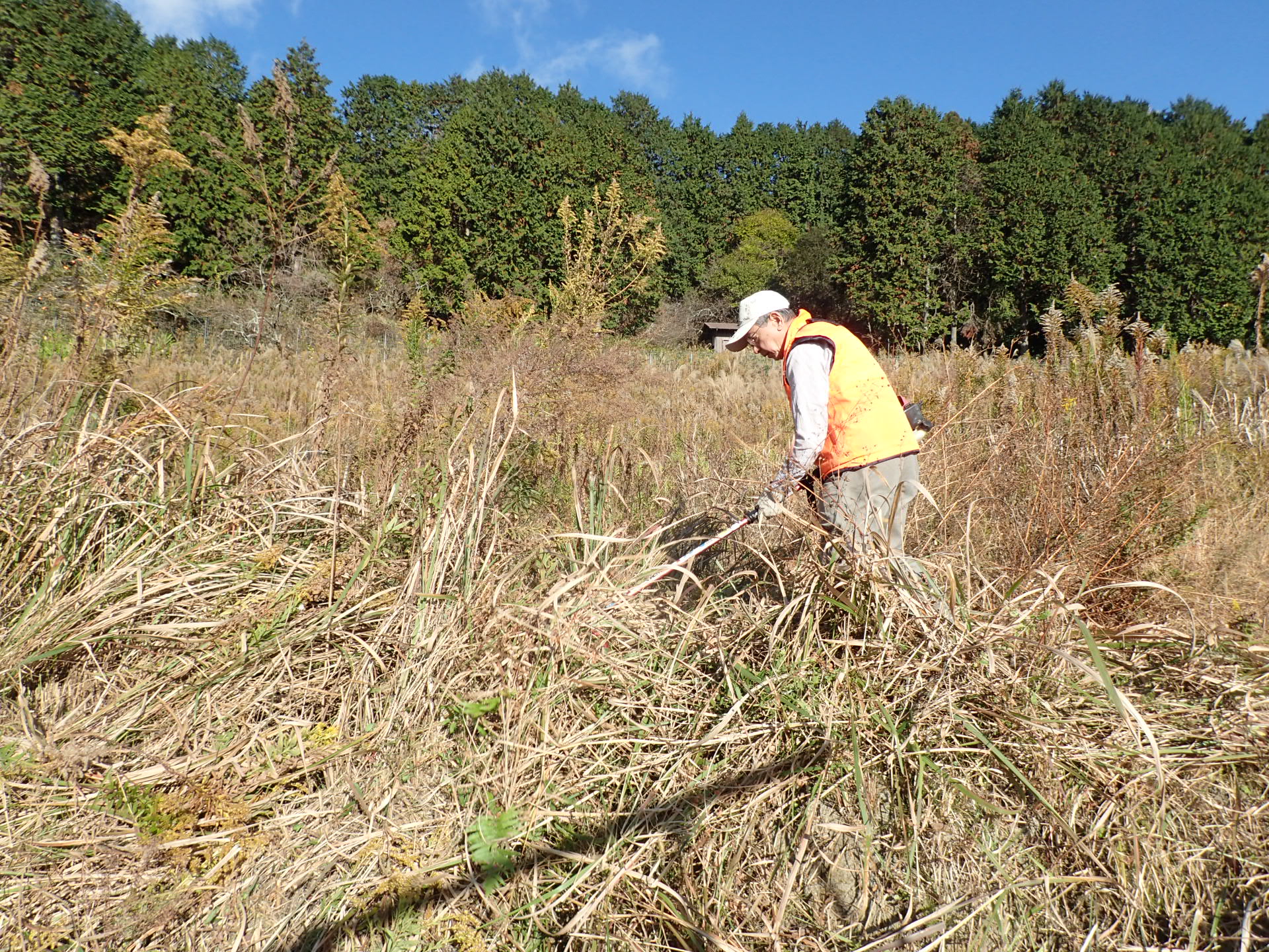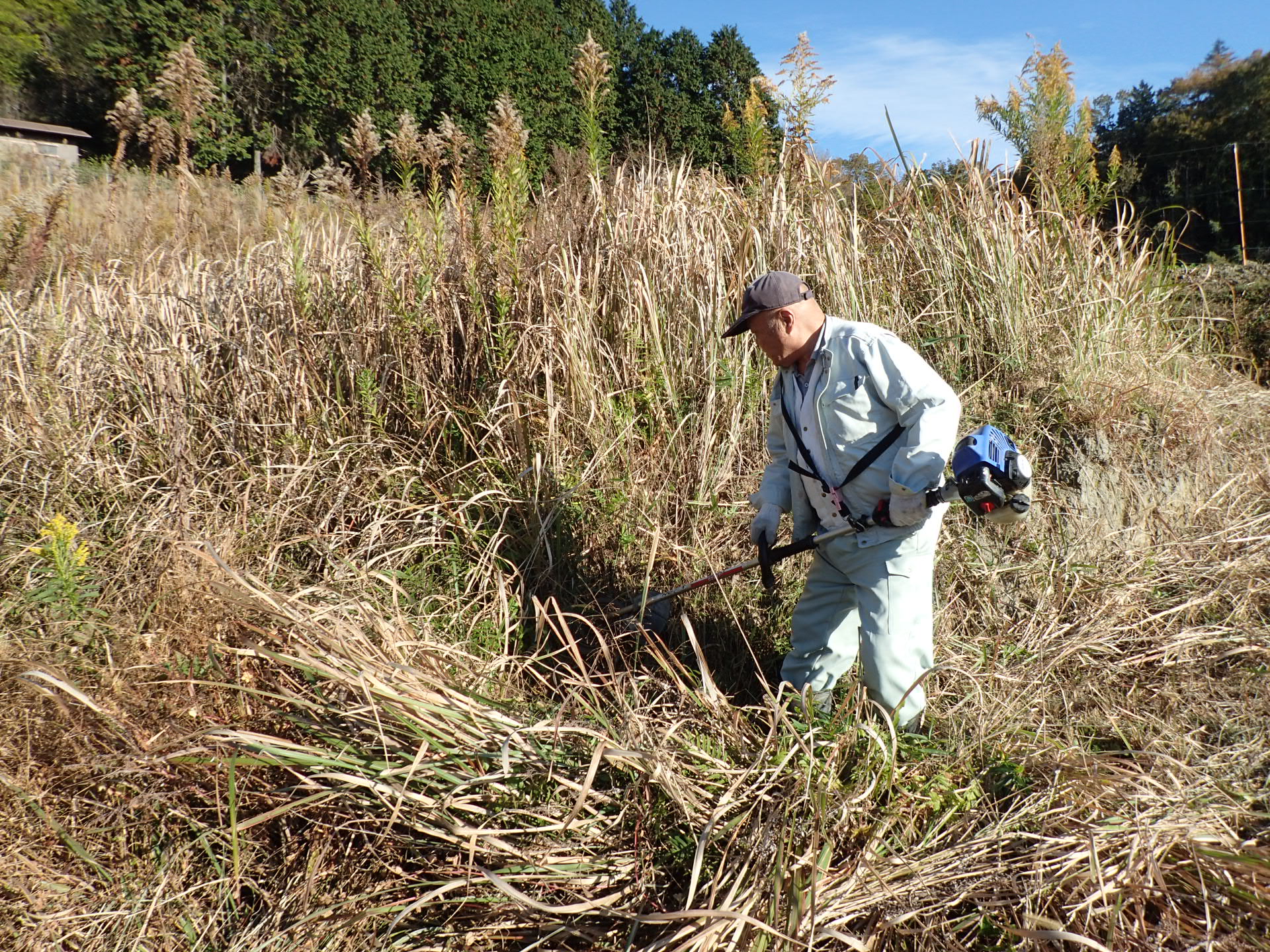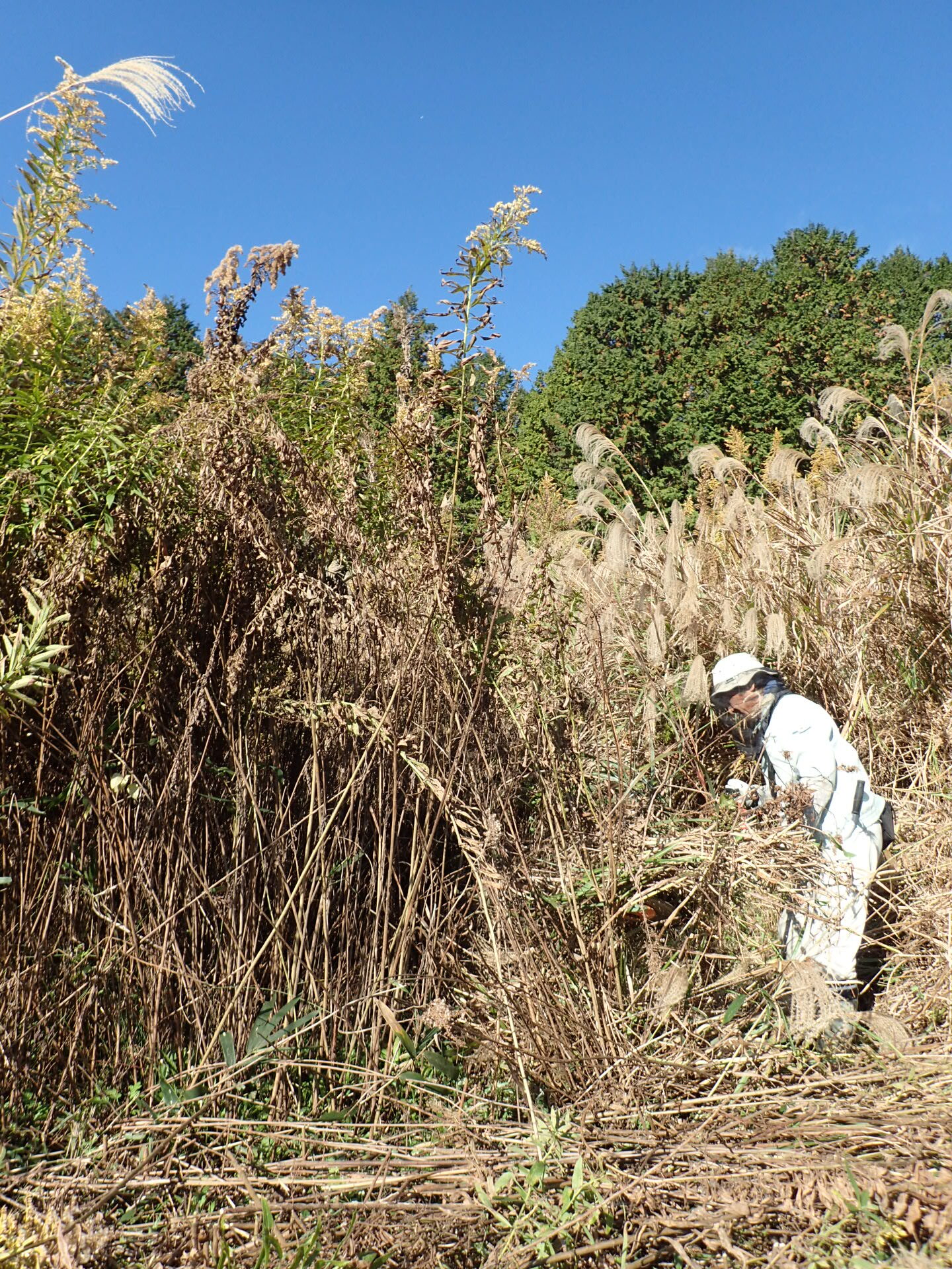 秋に立ち枯れになっている草は固く背が高いと余計に刈りにくいものです。セイタカアワダチソウは特に茎が固く密集するので刈り倒すのがとても厄介です。あと、綿毛(?)も飛ぶので鬱陶しいばかりです。ベテランでもなかなか進まないし、とにかく疲れます。皆で出動してやるので何とかやっていけますが、一人だと一時間もしないうちにめげて終了です。