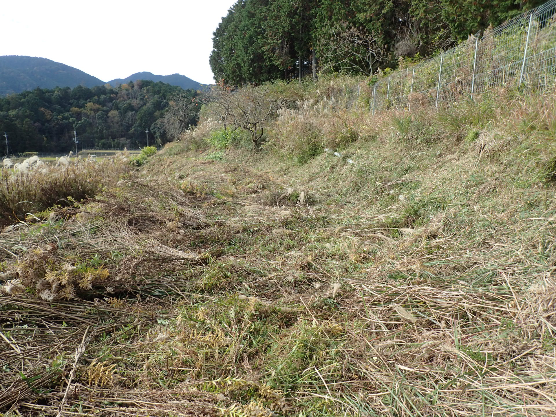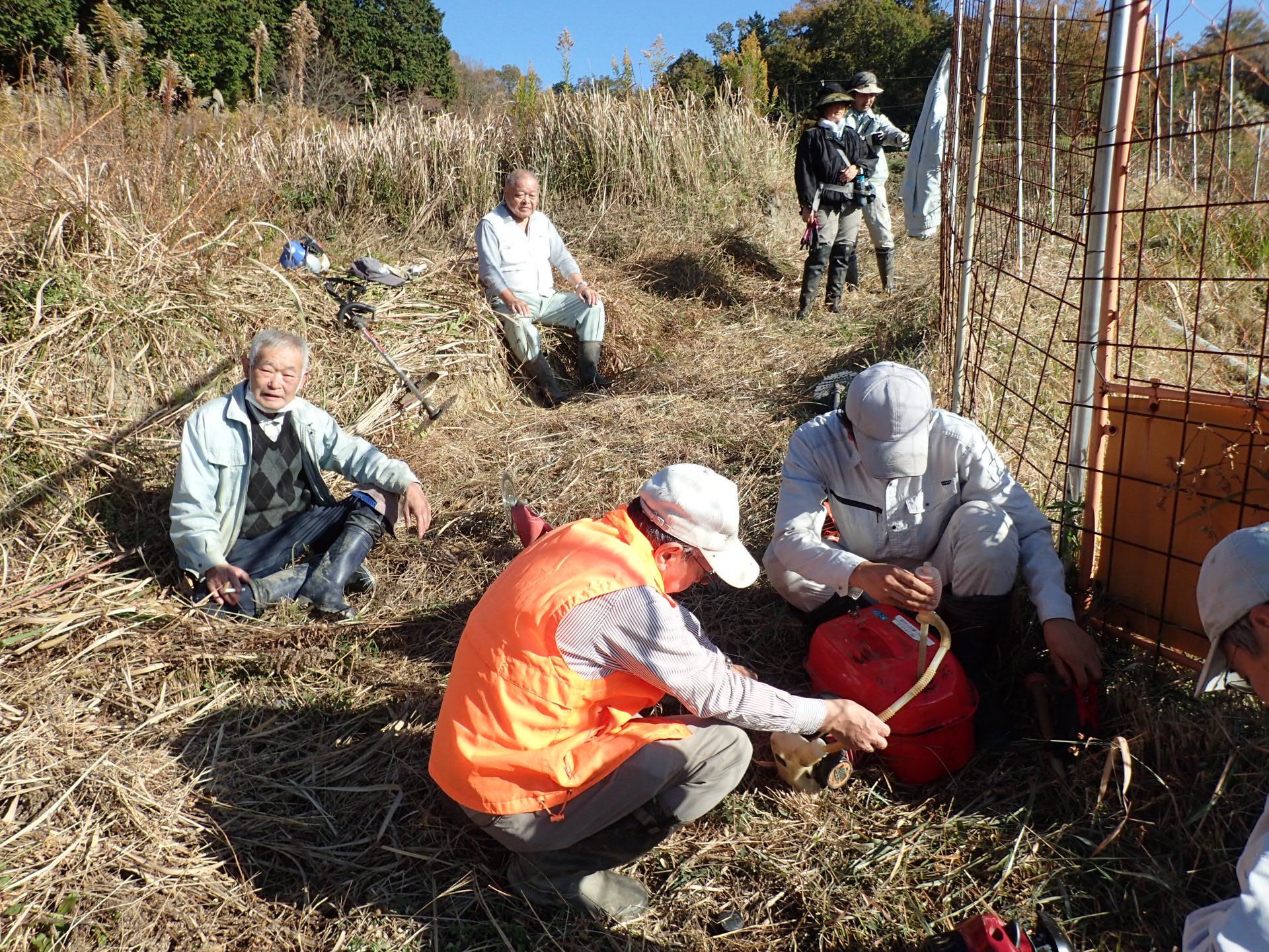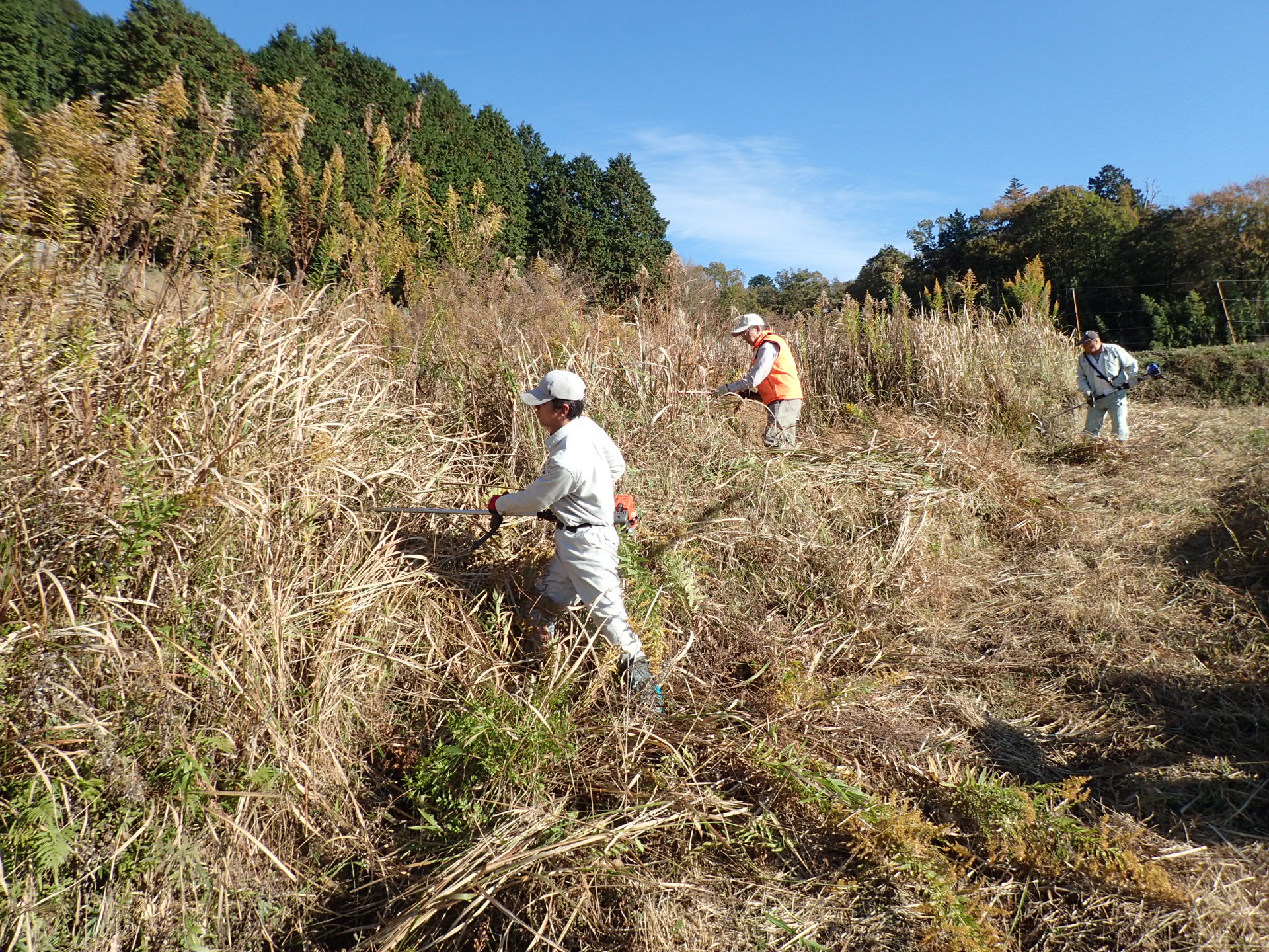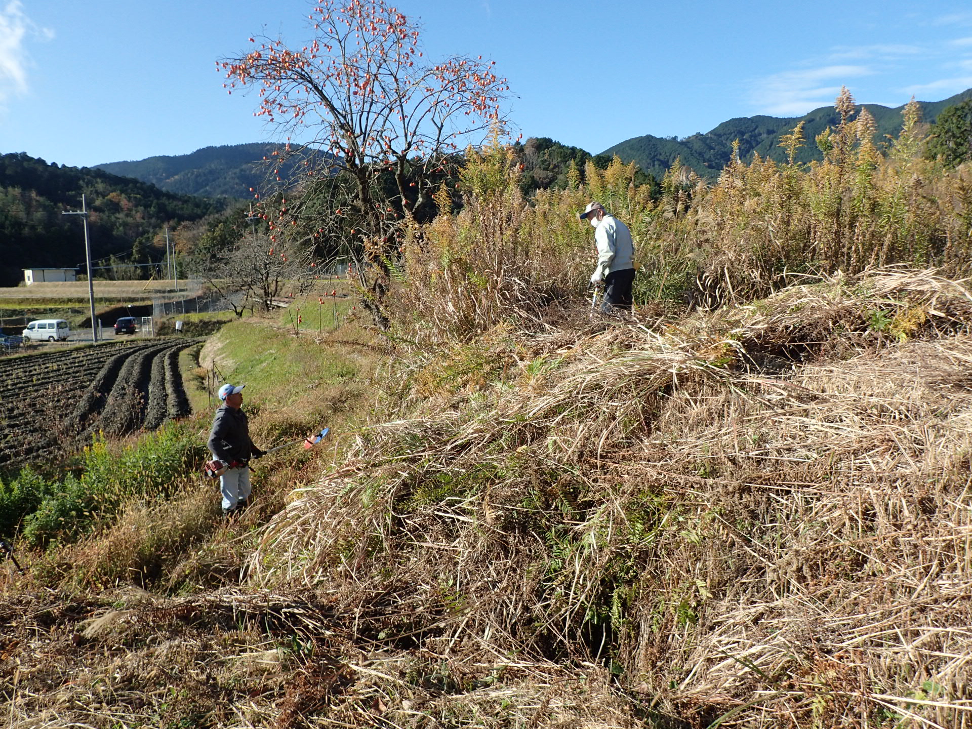 秋に立ち枯れになっている草は固く背が高いと余計に刈りにくいものです。セイタカアワダチソウは特に茎が固く密集するので刈り倒すのがとても厄介です。あと、綿毛(?)も飛ぶので鬱陶しいばかりです。ベテランでもなかなか進まないし、とにかく疲れます。皆で出動してやるので何とかやっていけますが、一人だと一時間もしないうちにめげて終了です。