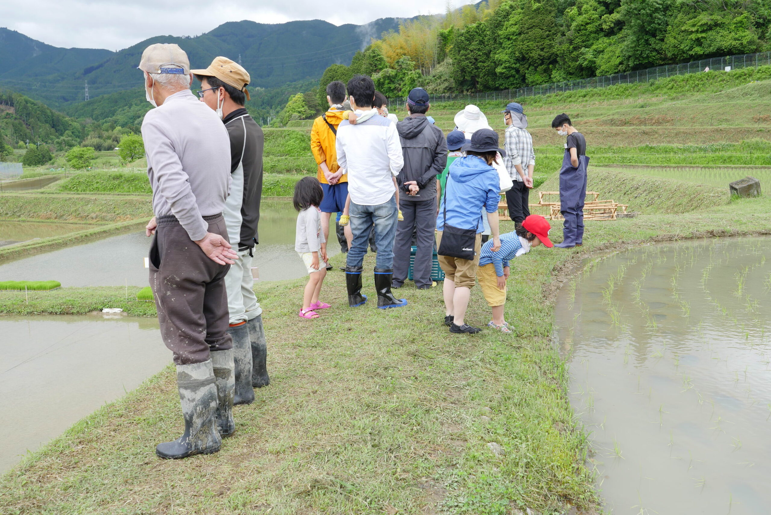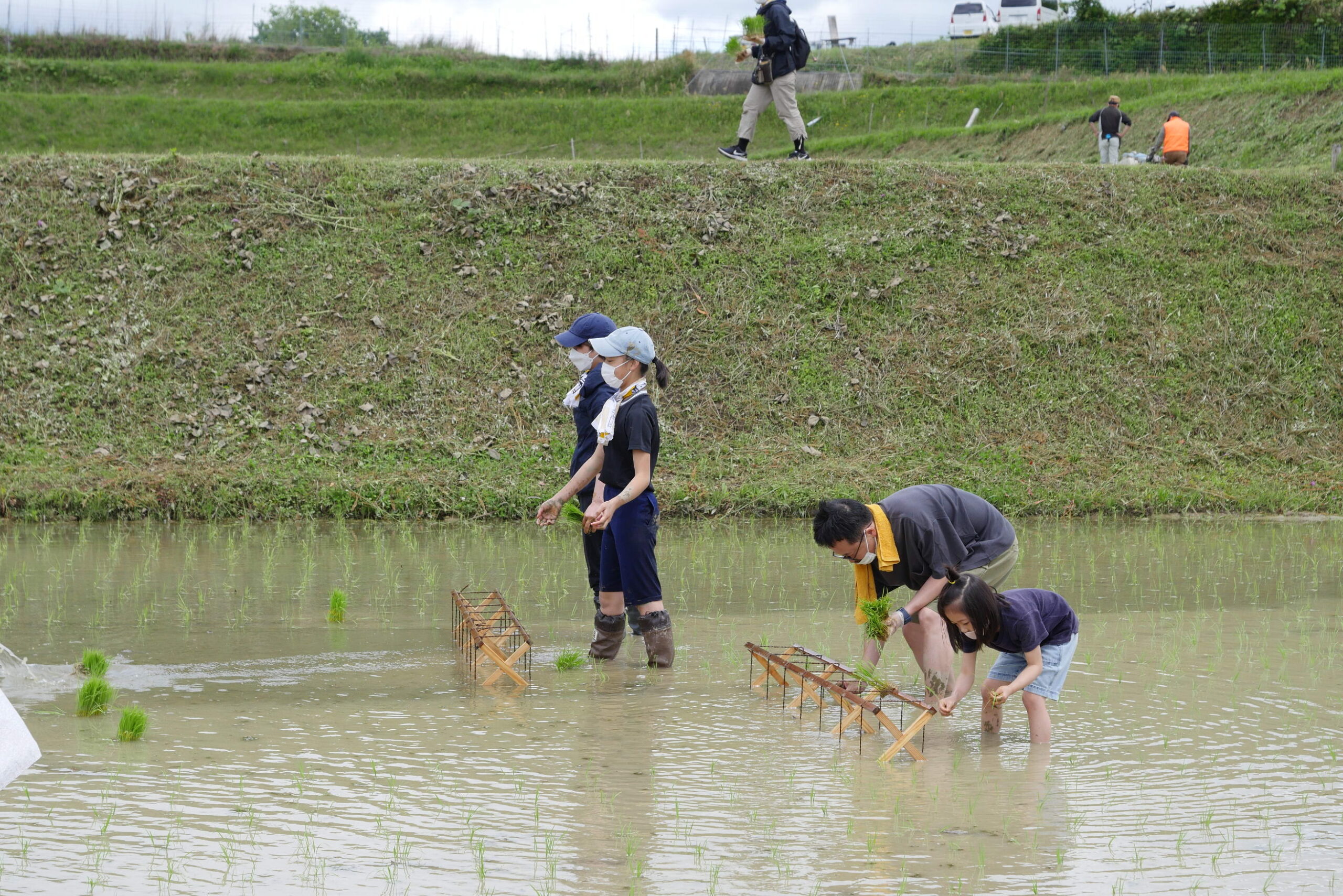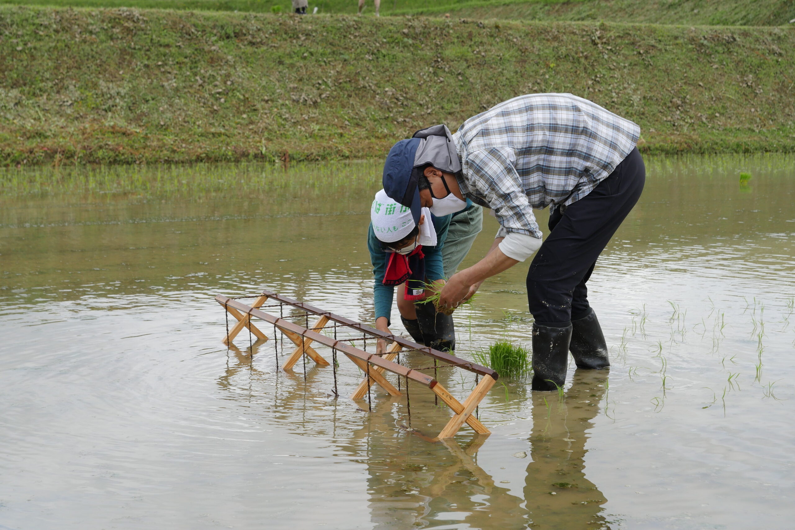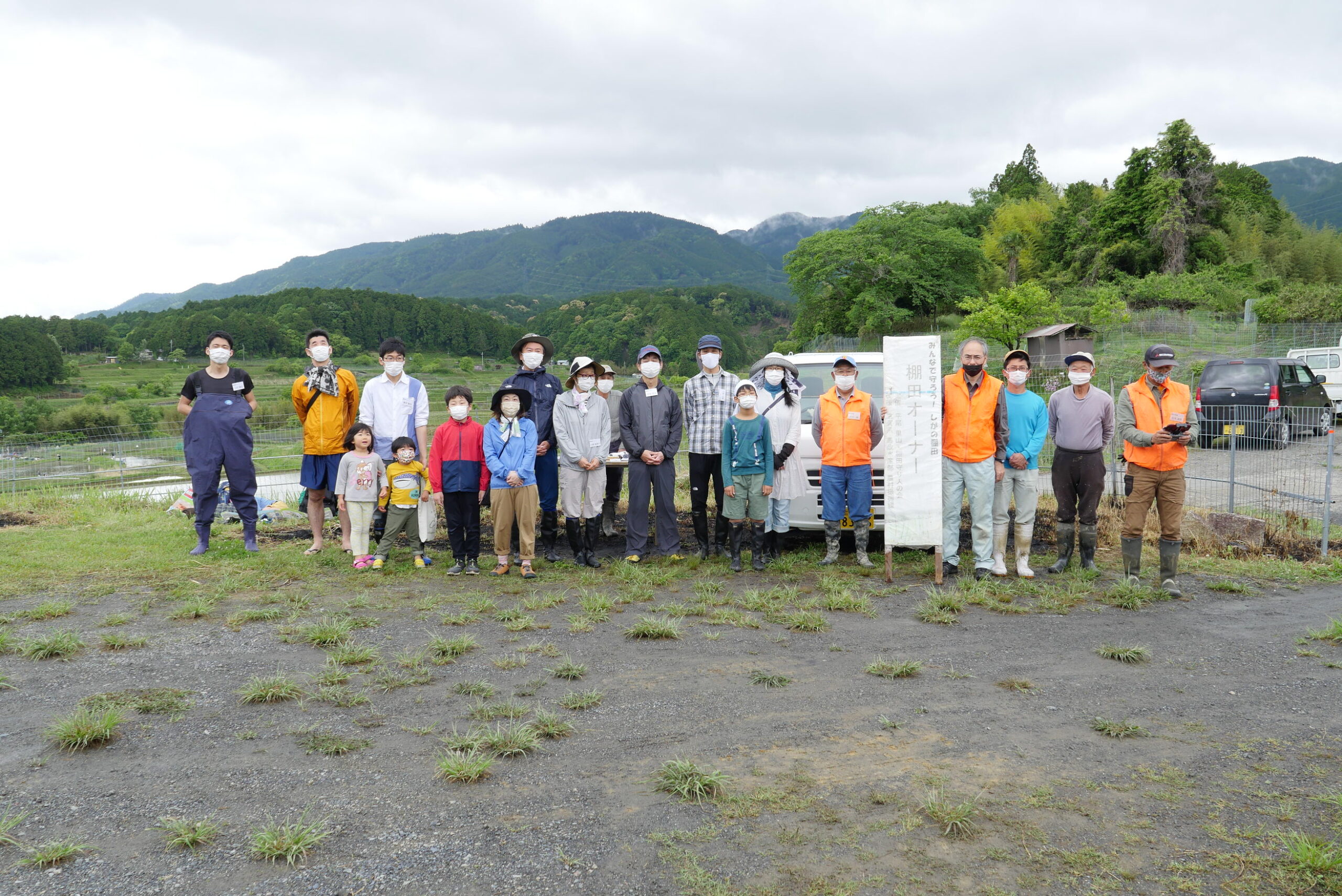 どんよりした空のもと2022年度のオーナー制度田植えがスタートしました。