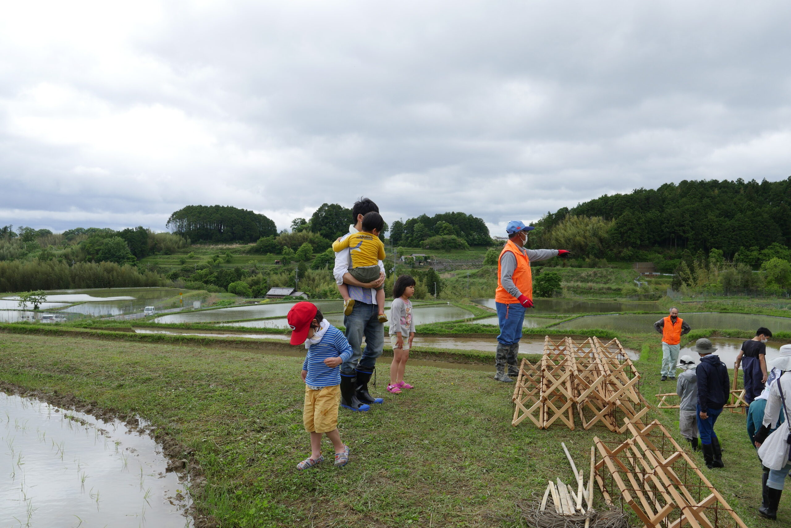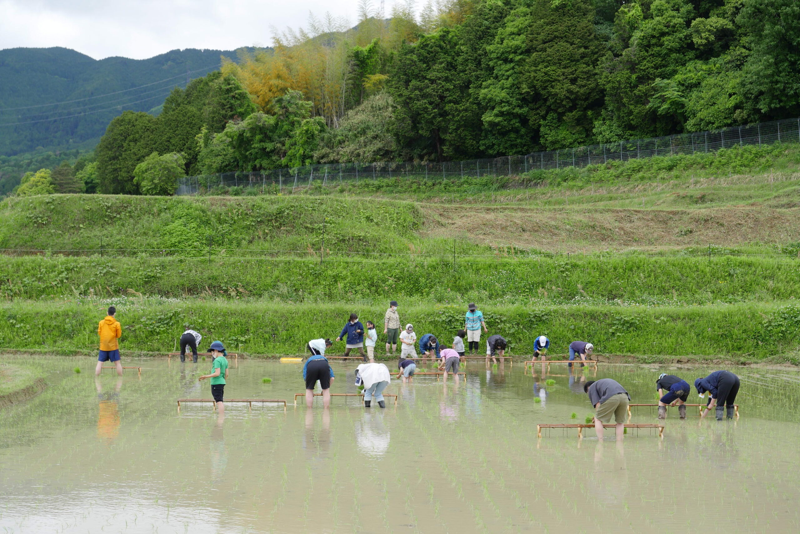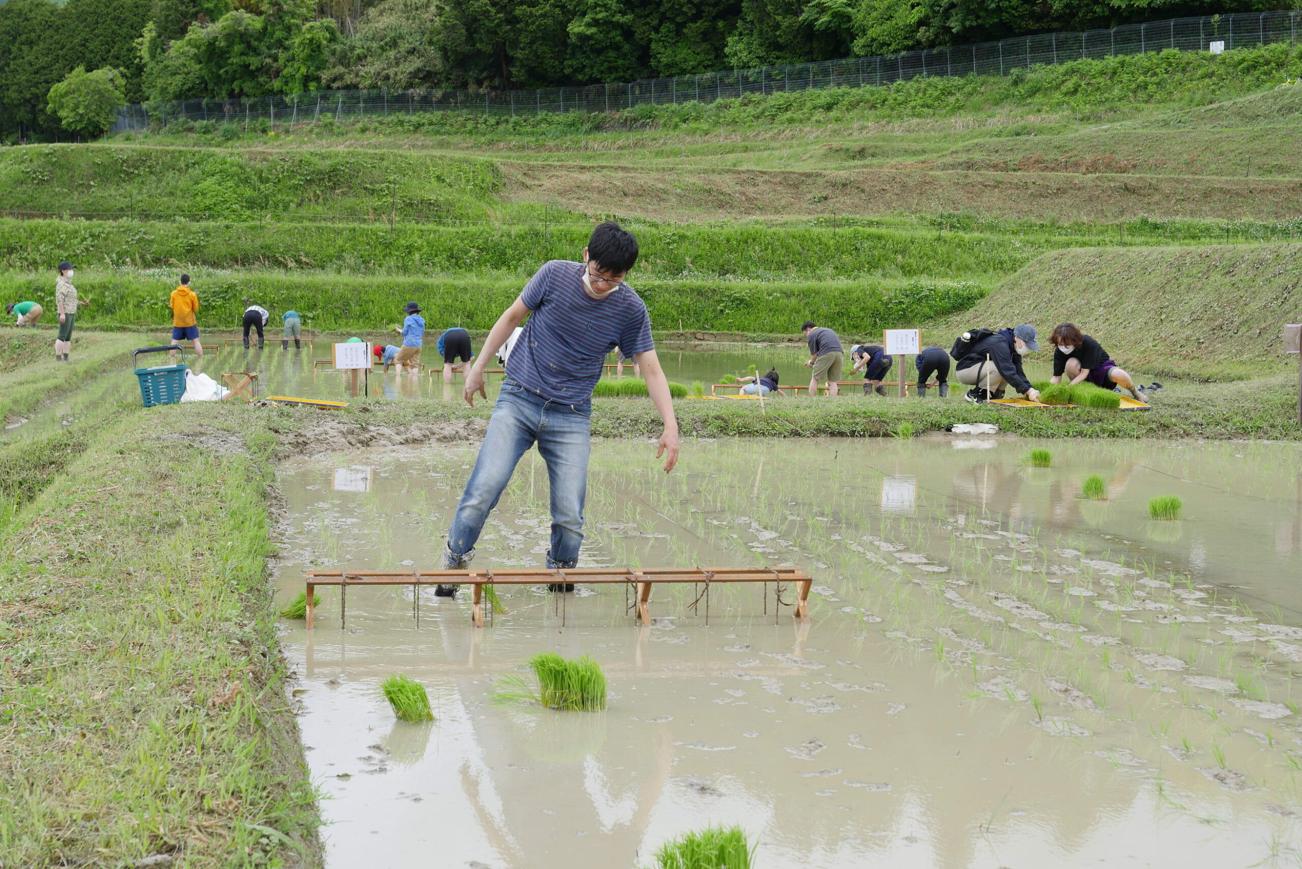どんよりした空のもと2022年度のオーナー制度田植えがスタートしました。