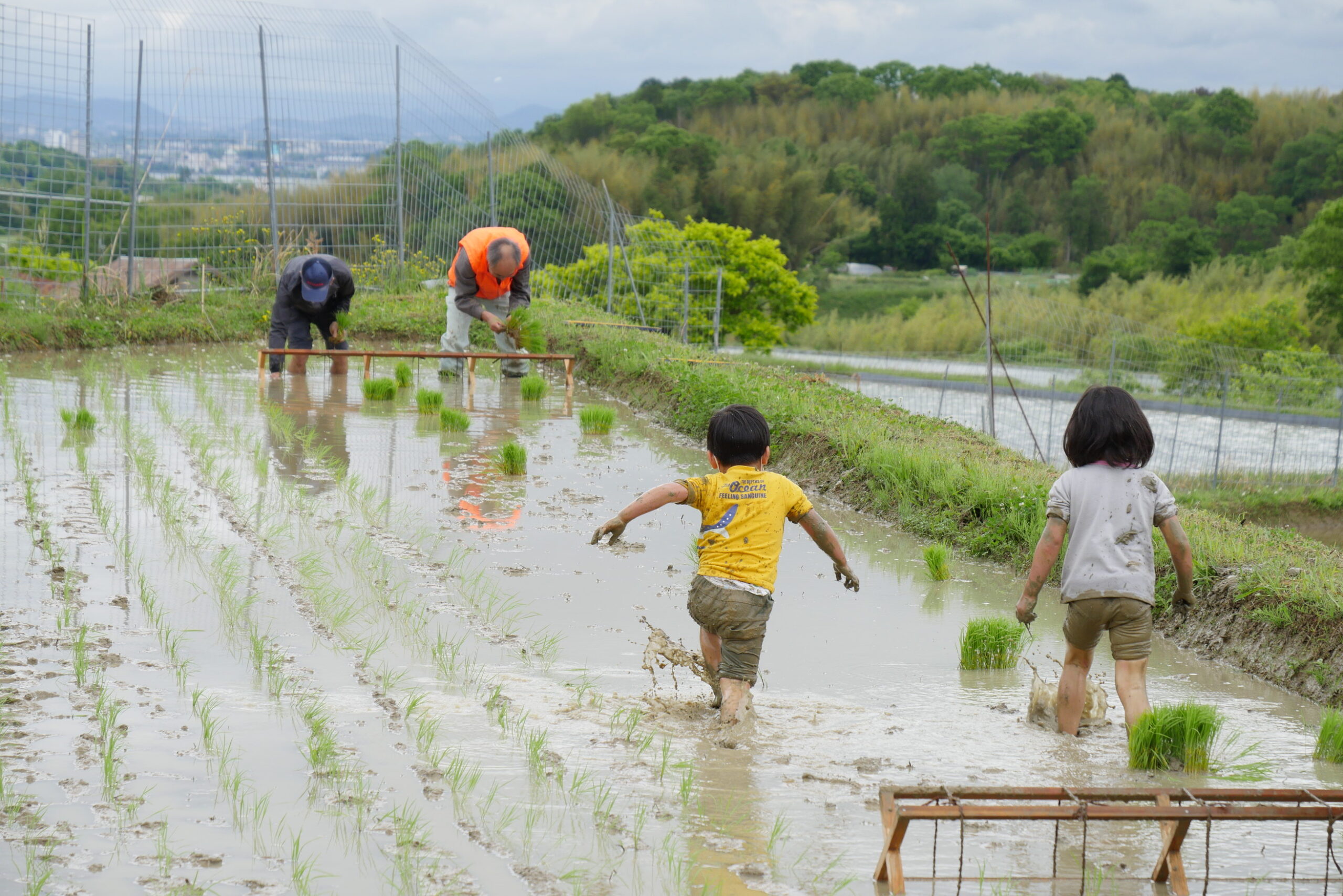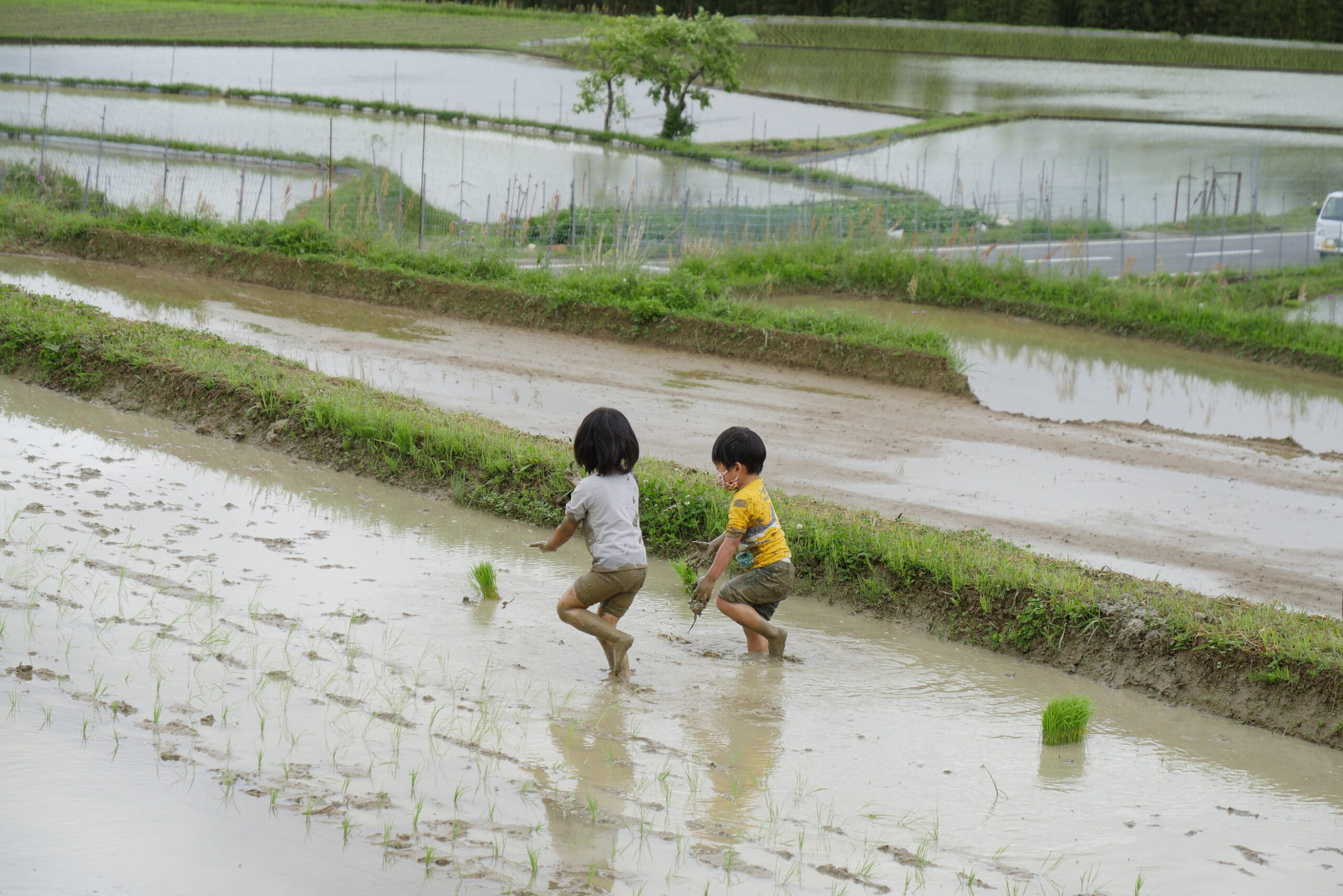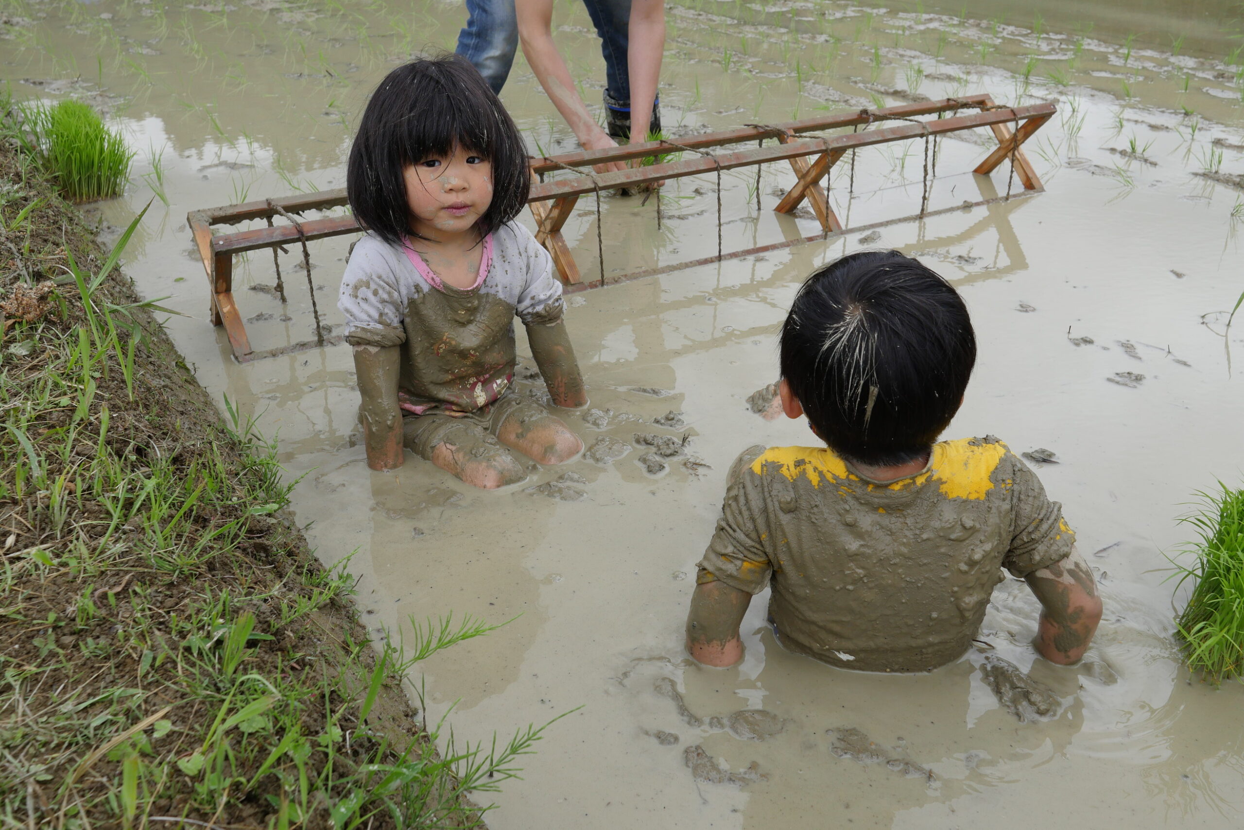 こどもたちも元気いっぱいで田植えをして・・・、ありゃ、田んぼに入浴しちゃってますね(^_^;)