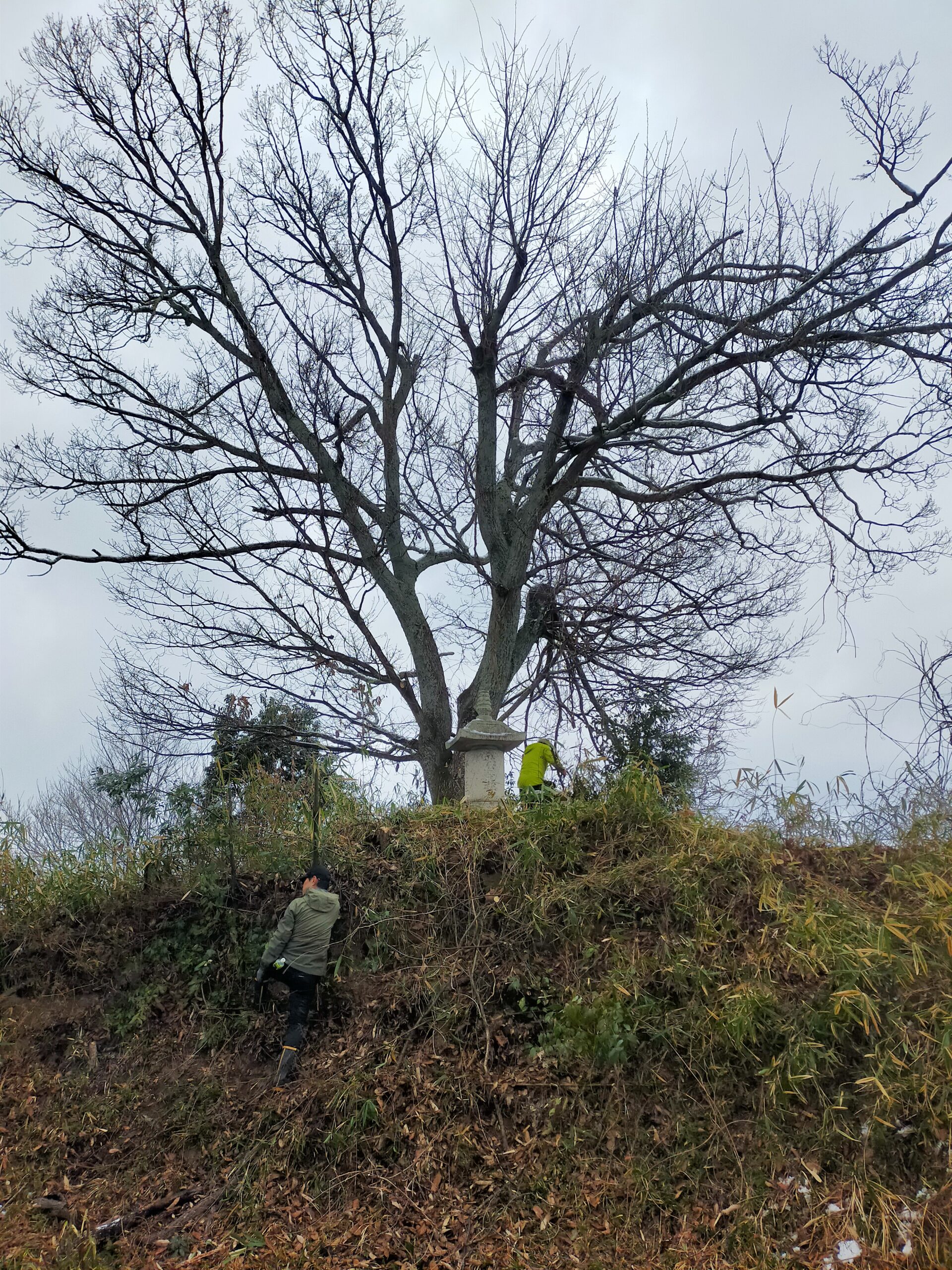 法華塔は集落と田んぼとの辻にあって、大昔は灯台の役目をしたりモノノケの鎮魂をするなどに建てられたのだそうです。今ではそういったことは忘れ去られ塔も捨て置かれたようなありさまです。そのため塔の周辺が藪化してしまって、塔は見えなくなっています。地元会員からなんとかしたいという要望があって、ボランティア作業にしました。