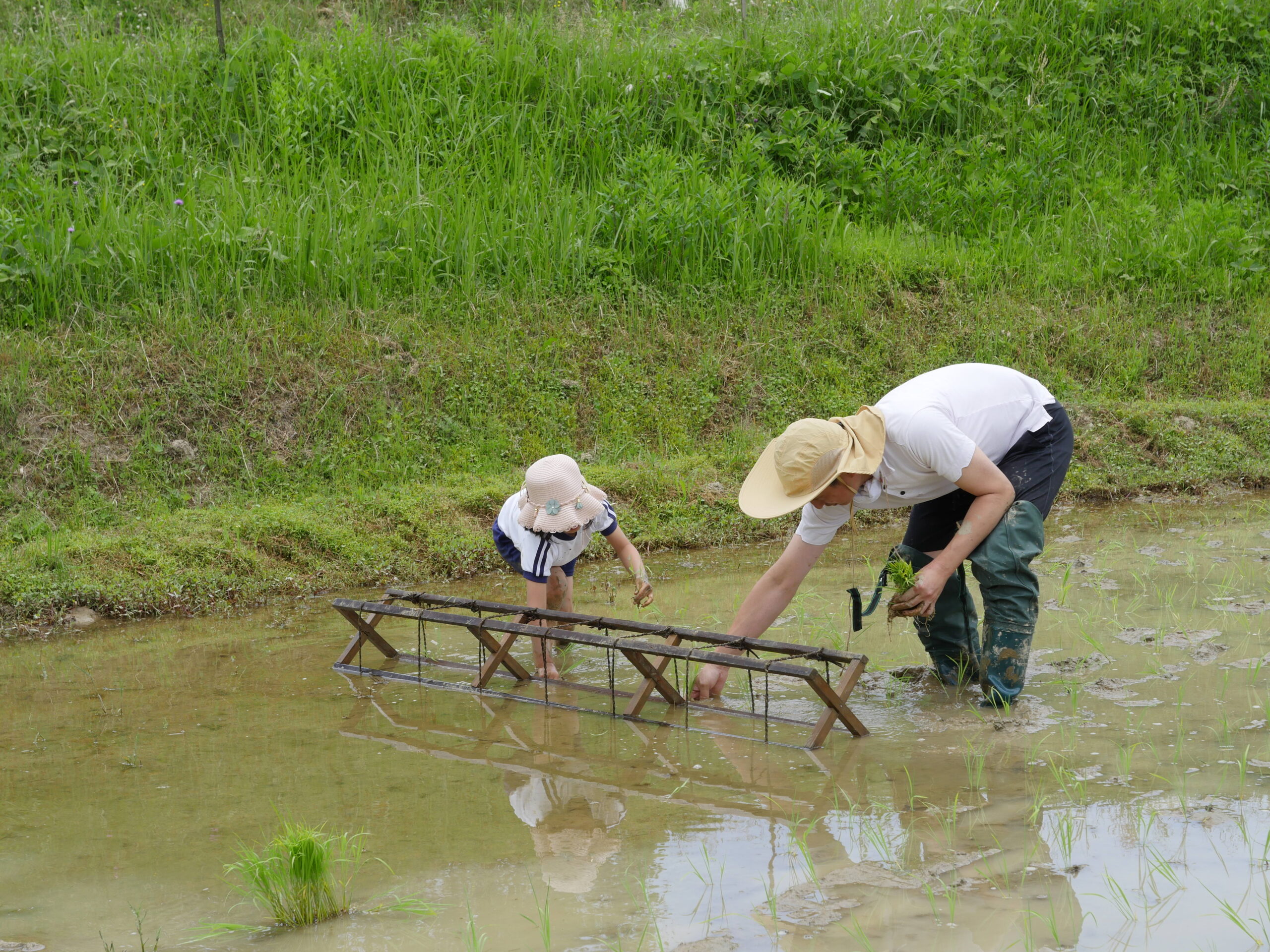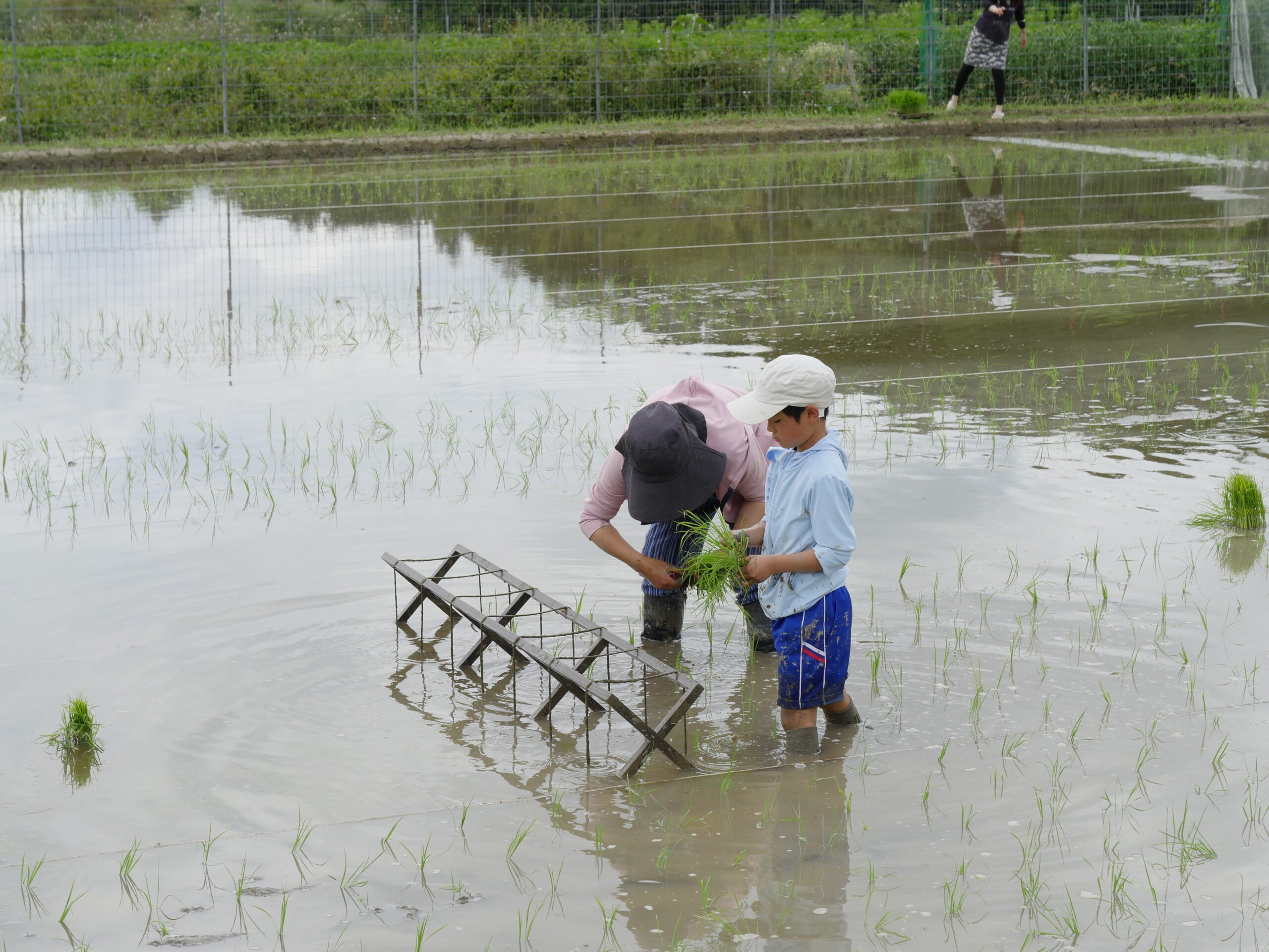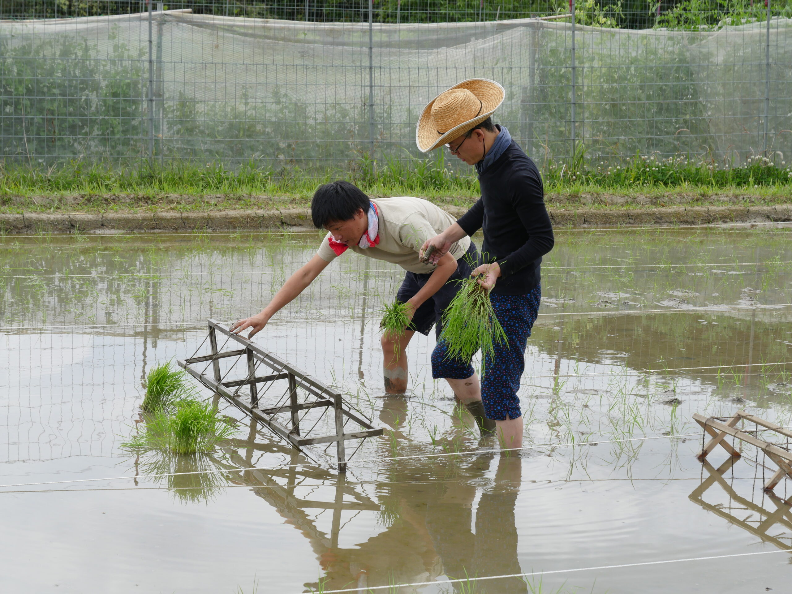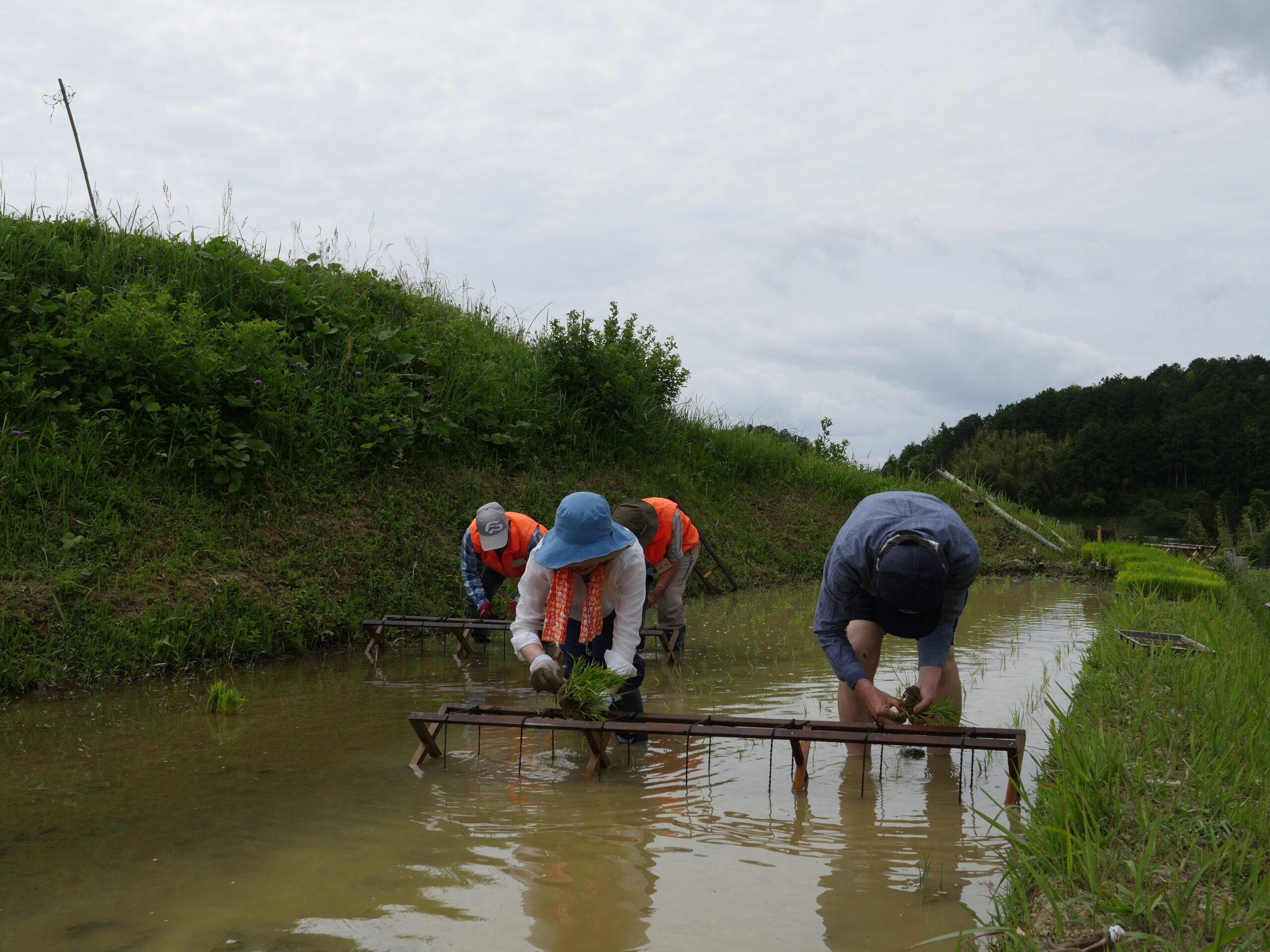 当会主催の田植えも今日が最後です。今日は都市住民が管理する班ともち米のオーナー制度の田植えをしました。
