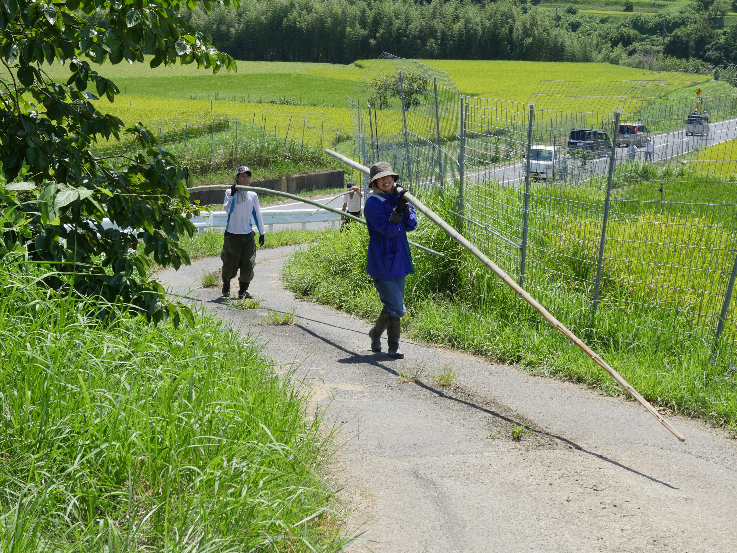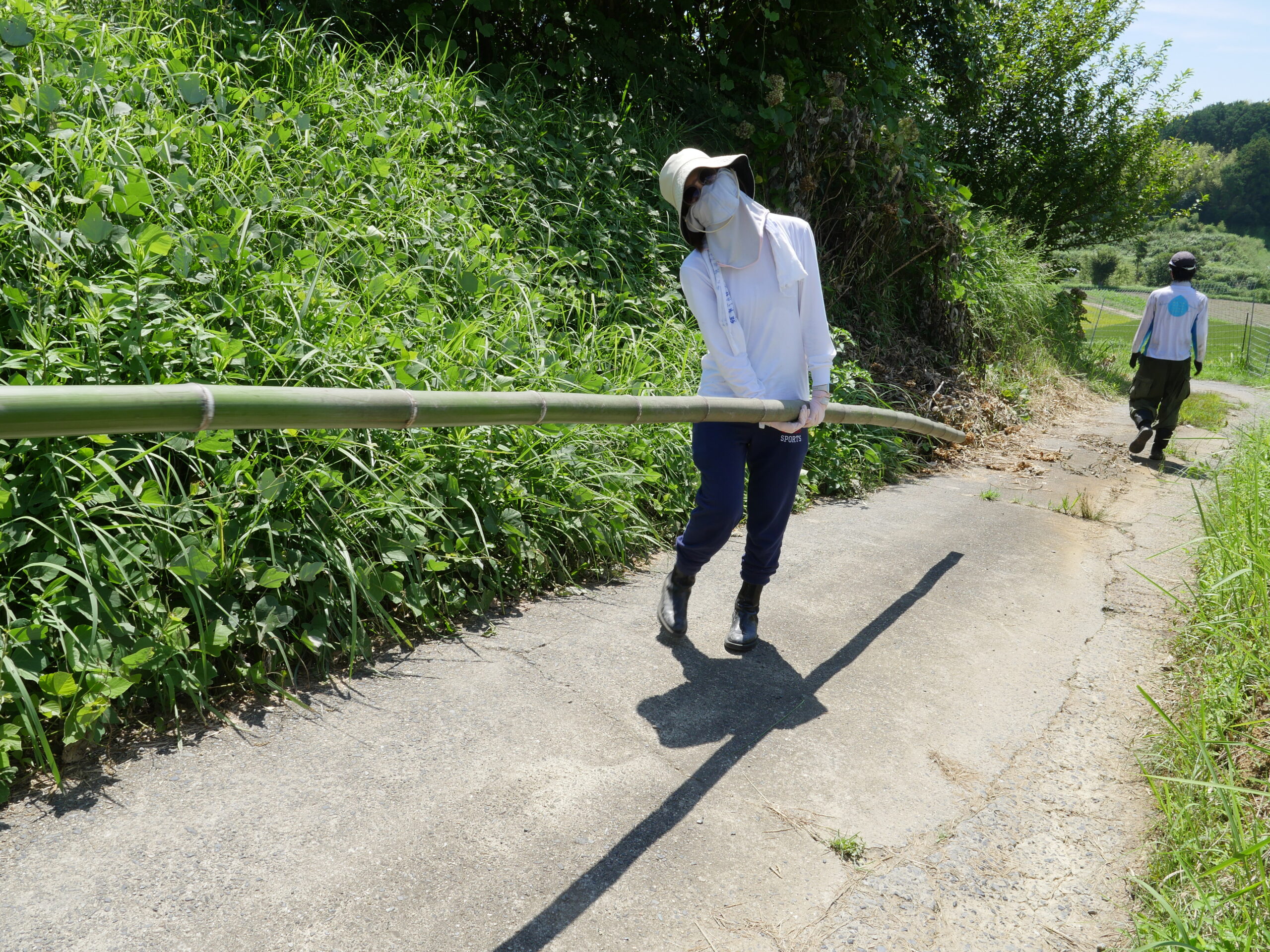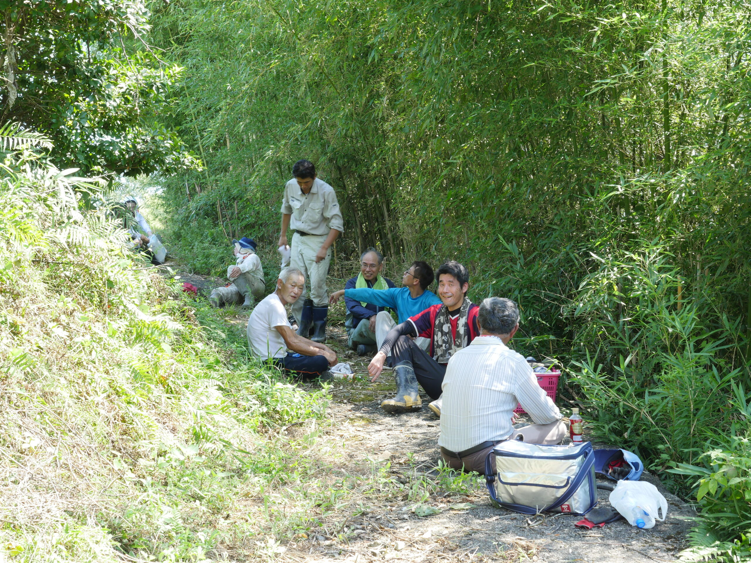 竹の切り出しも人が多いと分担できるし、早く終われて助かります。田んぼに日蔭は少ないので炎天下の中での作業になりますが、竹切りは日蔭もあって、休憩時は気持ち涼めます。でも蚊が・・・。