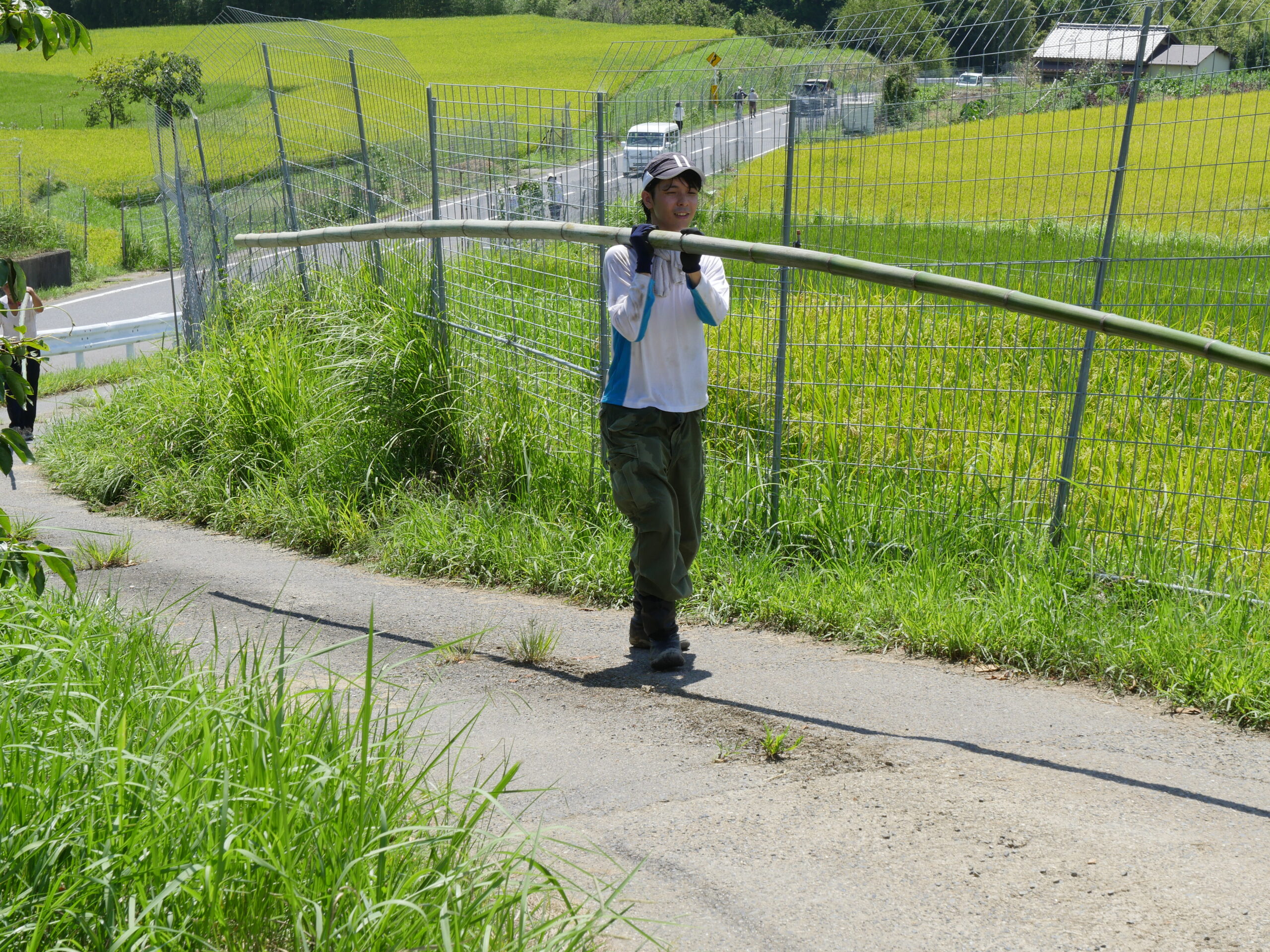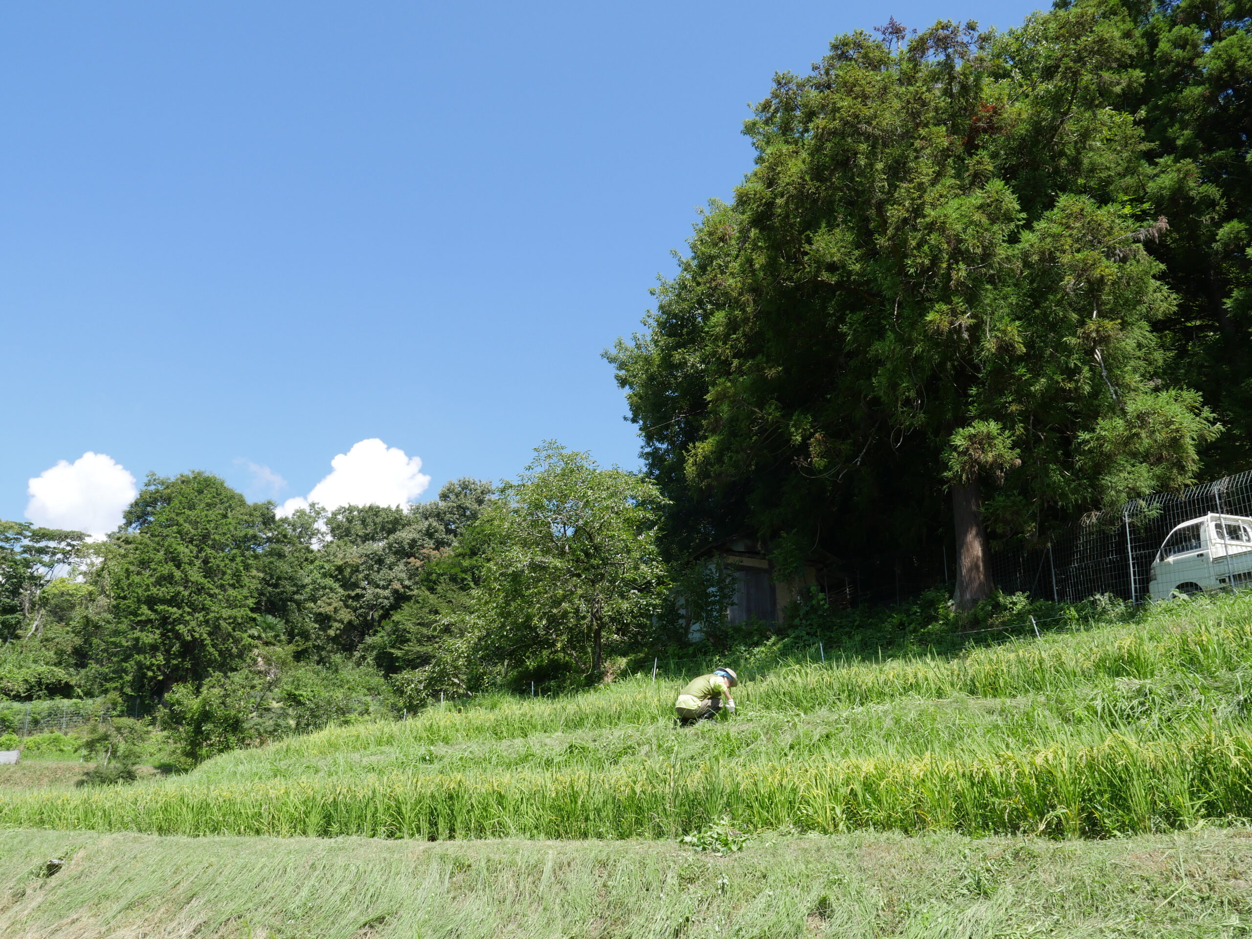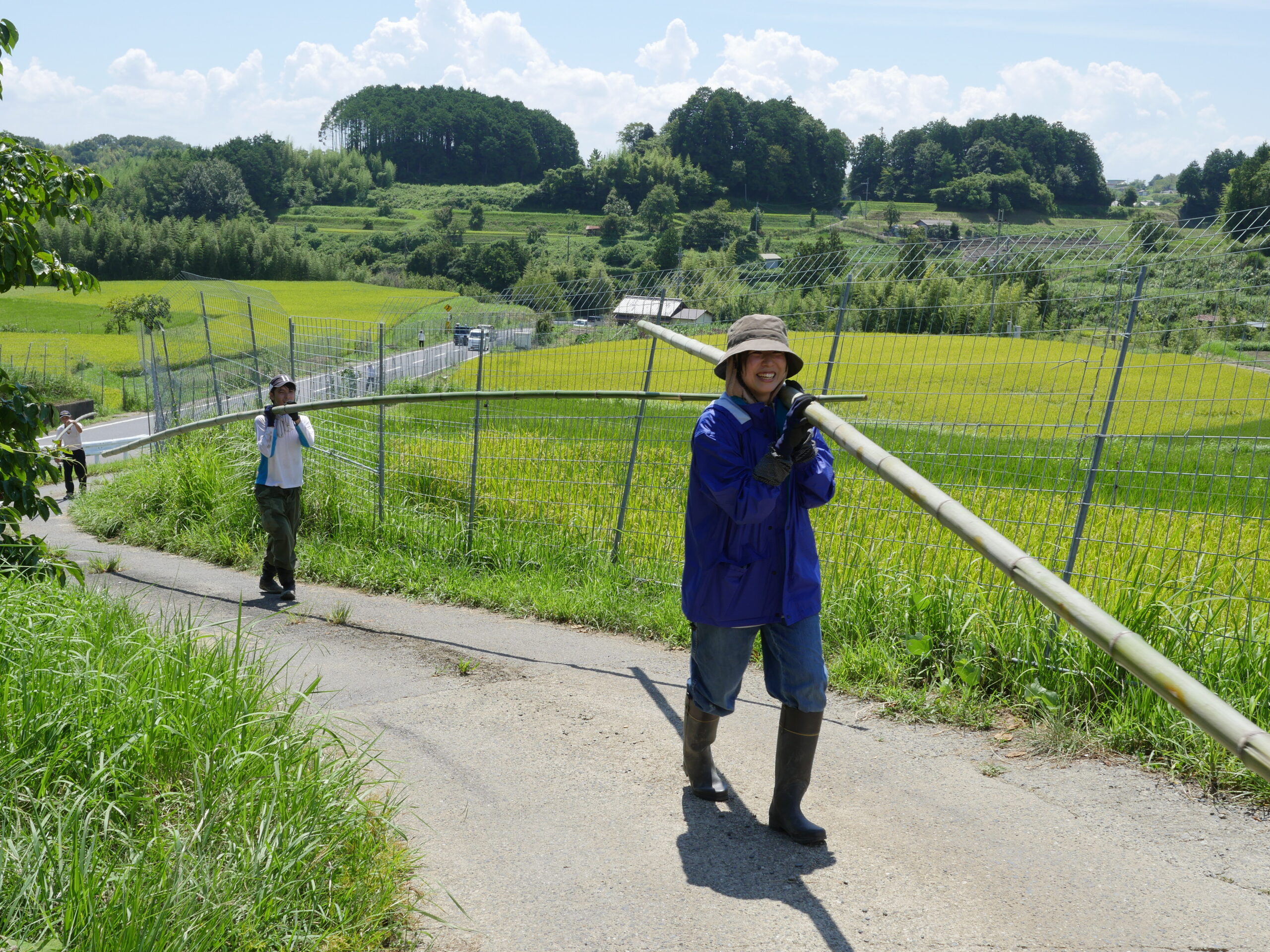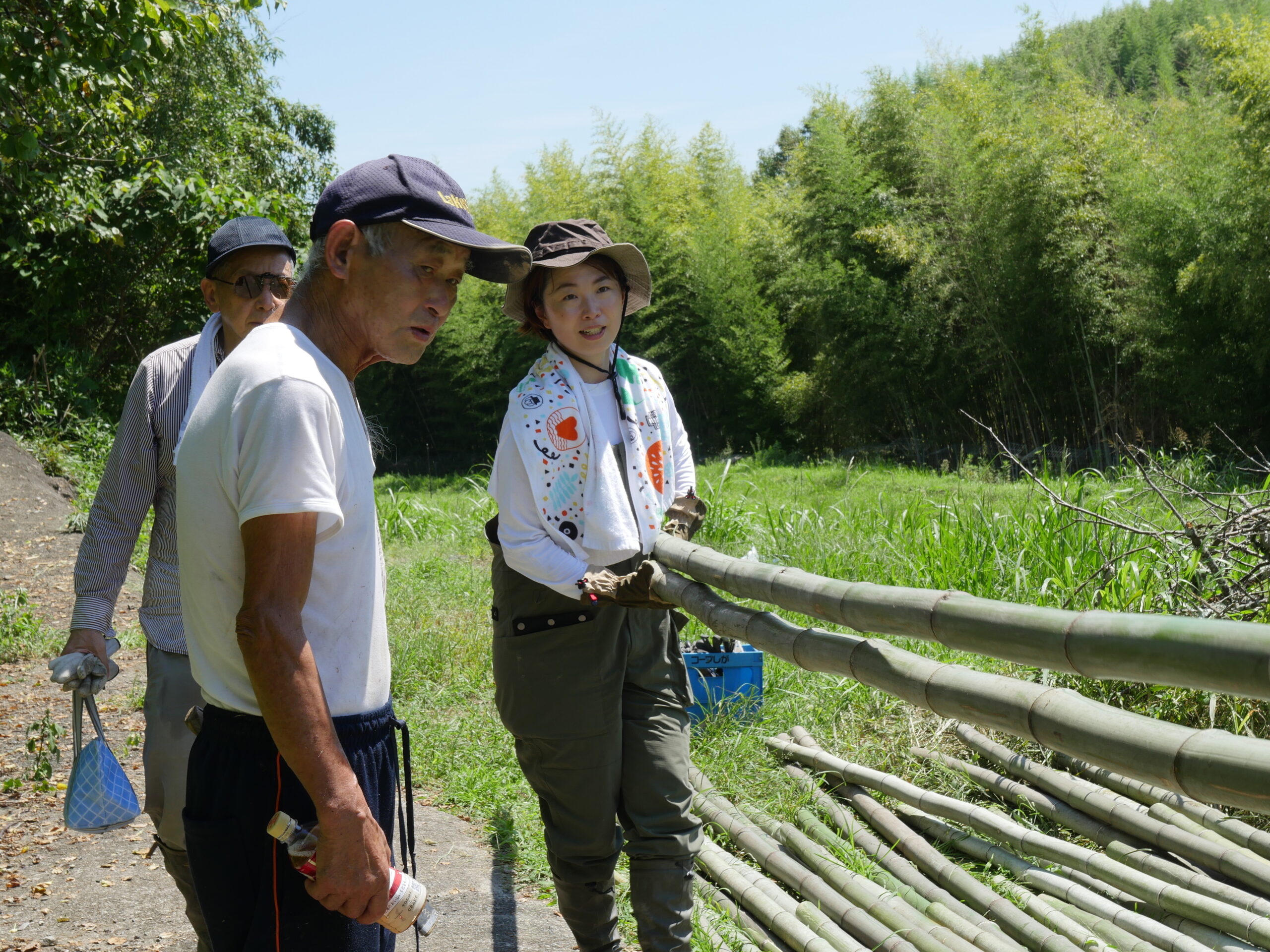 竹の切り出しも人が多いと分担できるし、早く終われて助かります。田んぼに日蔭は少ないので炎天下の中での作業になりますが、竹切りは日蔭もあって、休憩時は気持ち涼めます。でも蚊が・・・。